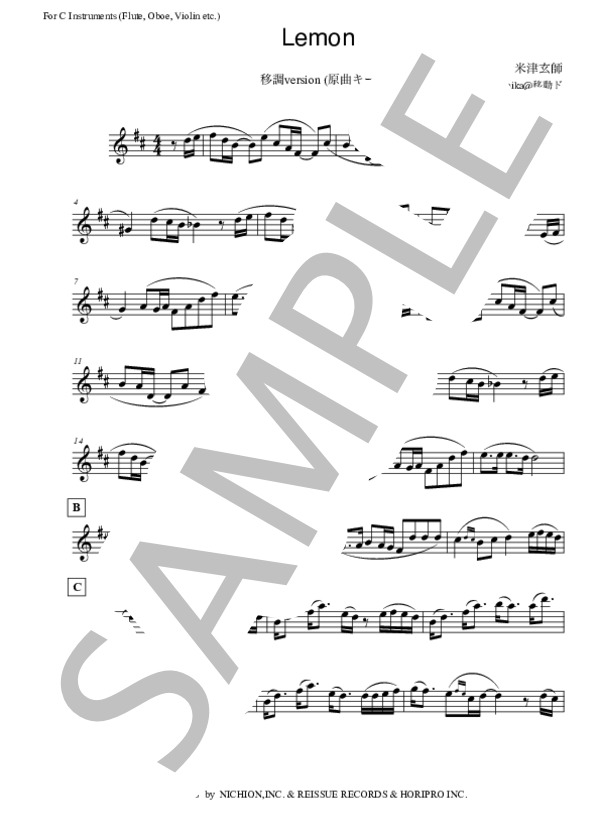 楽譜 In C Lemon 初 中級者向け フルート ヴァイオリン オーボエ等 米津 玄師 フルート 初 中級 Piascore 楽譜ストア